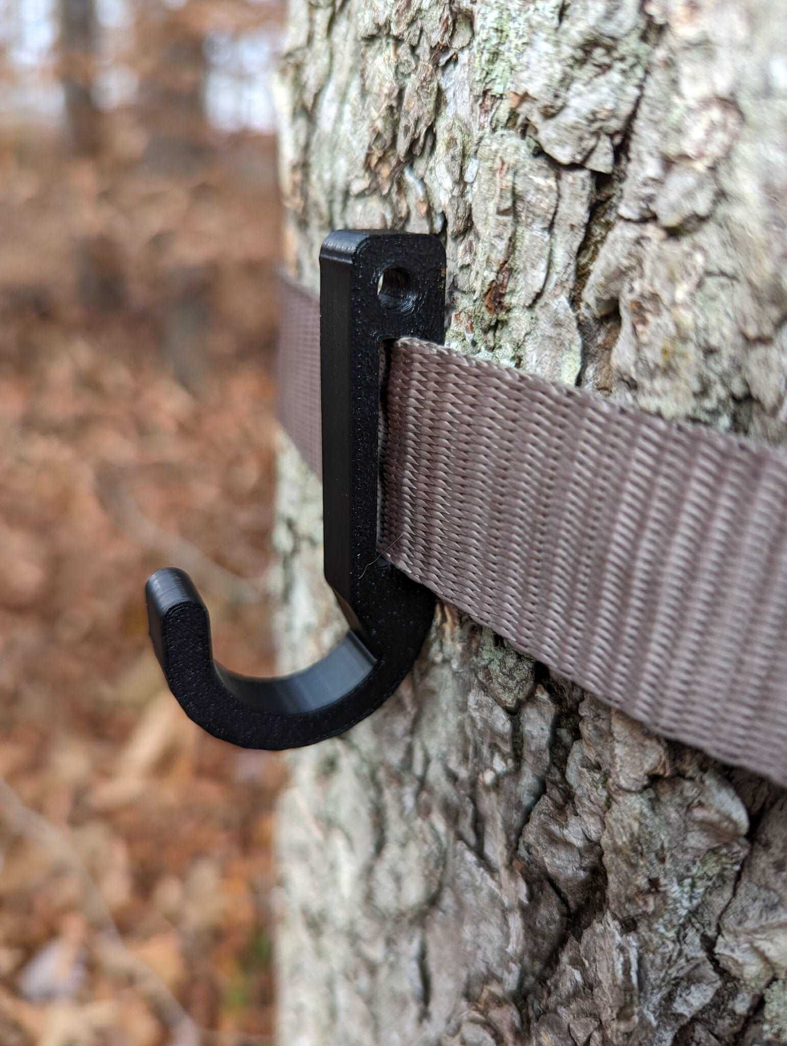 Closed gear Hook for Strap/Amsteel saddle/tree stand hunting. Hook has a gap of 1". Strap in picture not included.