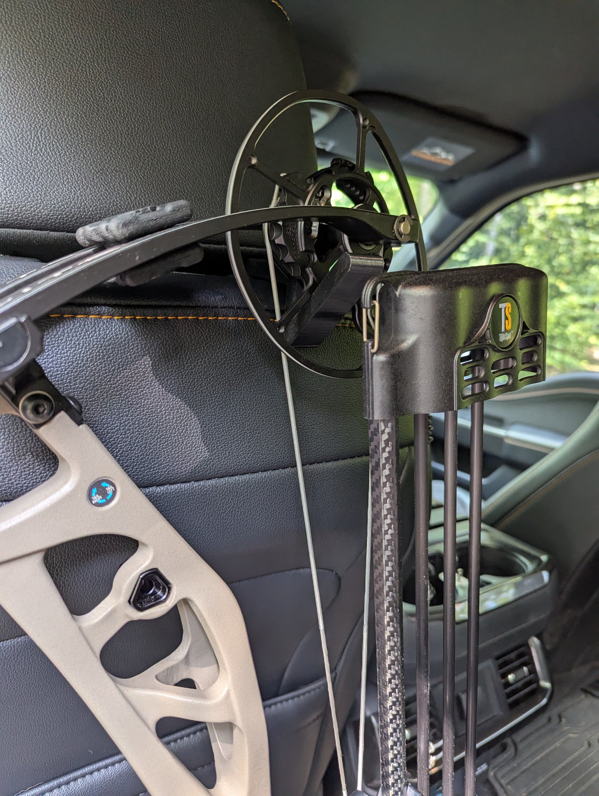 Versatile vehicle headrest attachment designed for hunters on the go. Buy 2 and mount across both posts to secure your bow, or use individually to organize essential gear. The perfect solution for keeping your hunting equipment accessible and secure during transport.