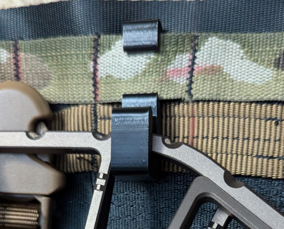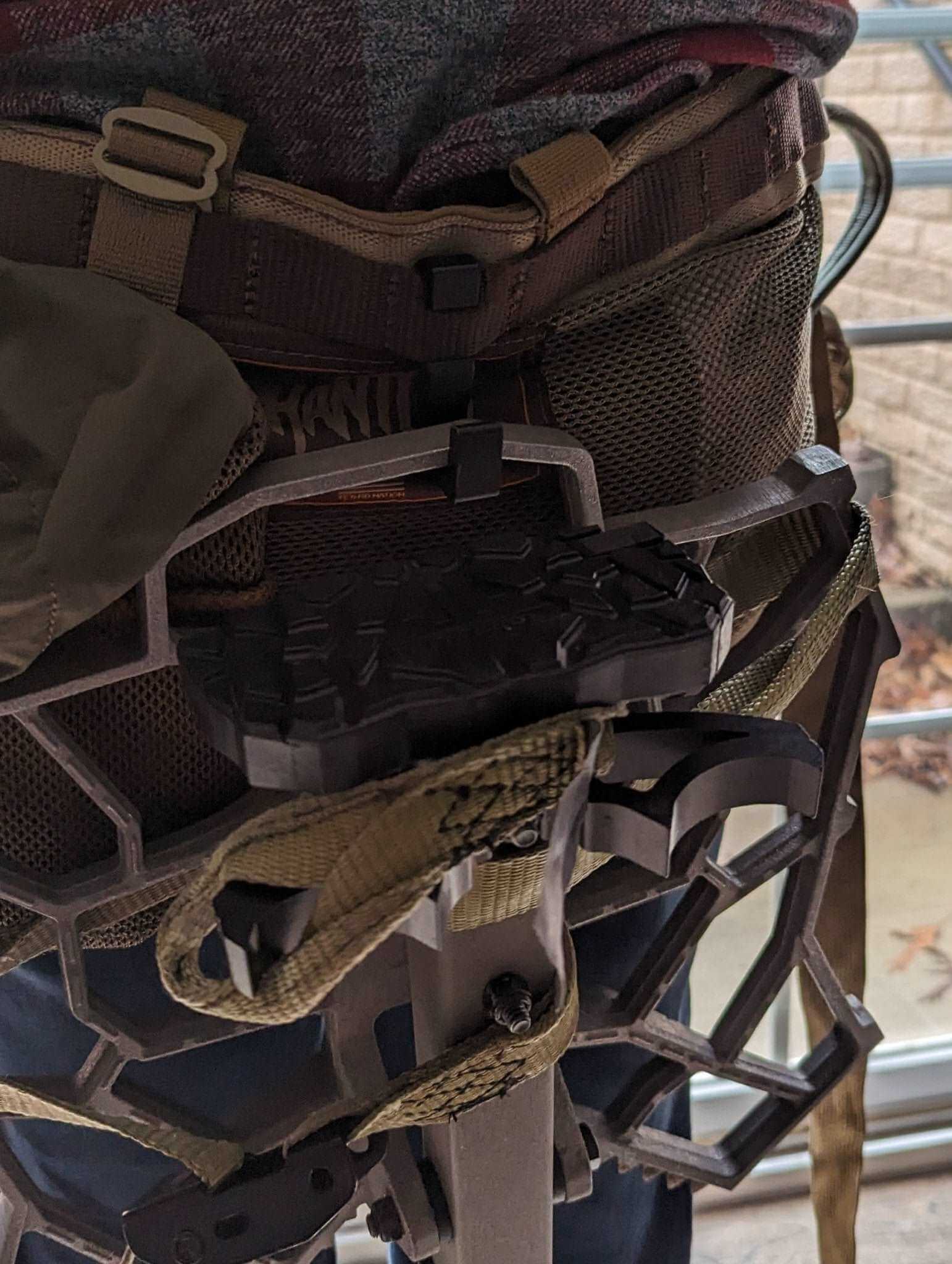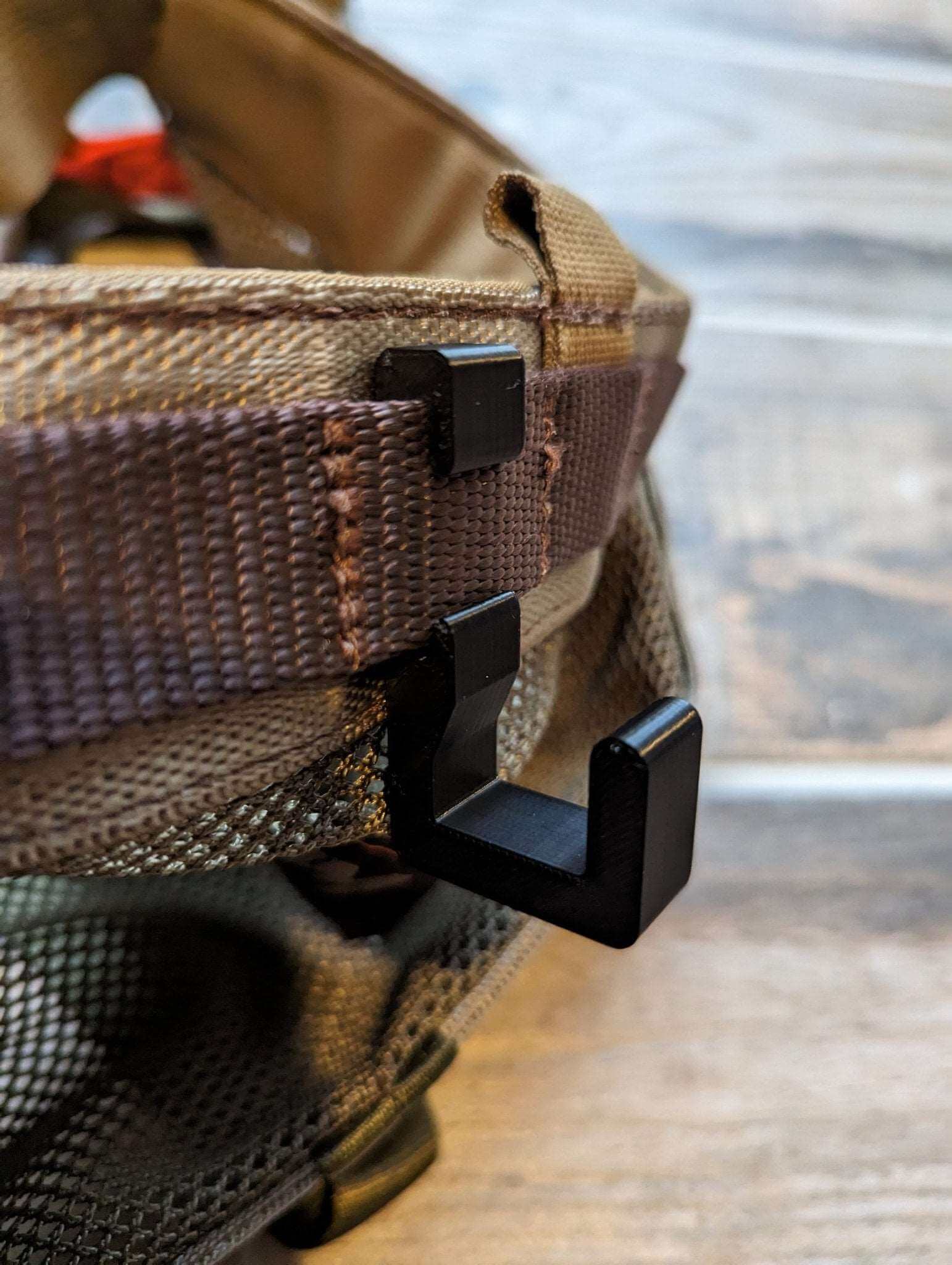 Molle/Saddle platform hanger/hook. Please select platform depth/thickness you need. Hanger is 1/2" wide and 3D printed with PETG filament. Pictured with hanger is a Trophyline EDP platform which uses a 3/4" size (saddle and platform not included).