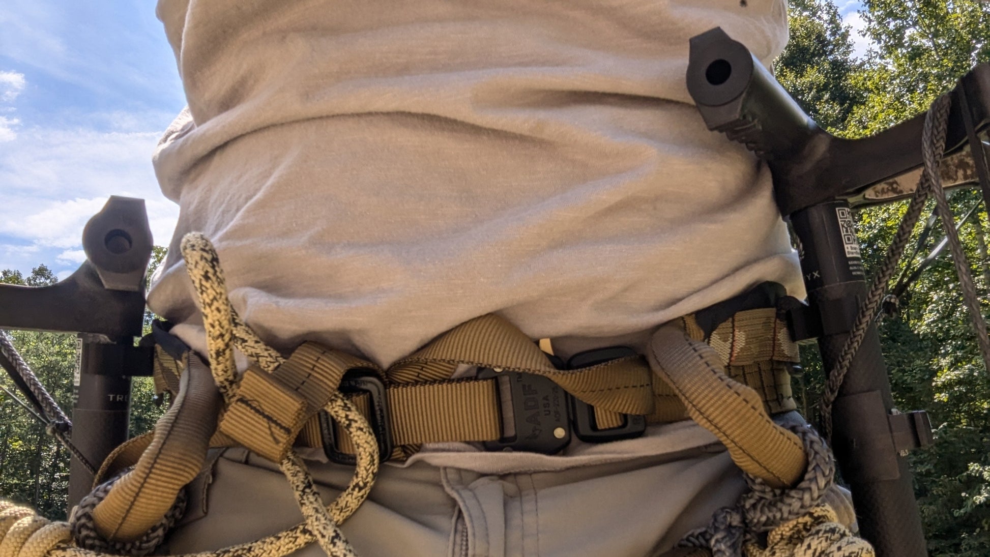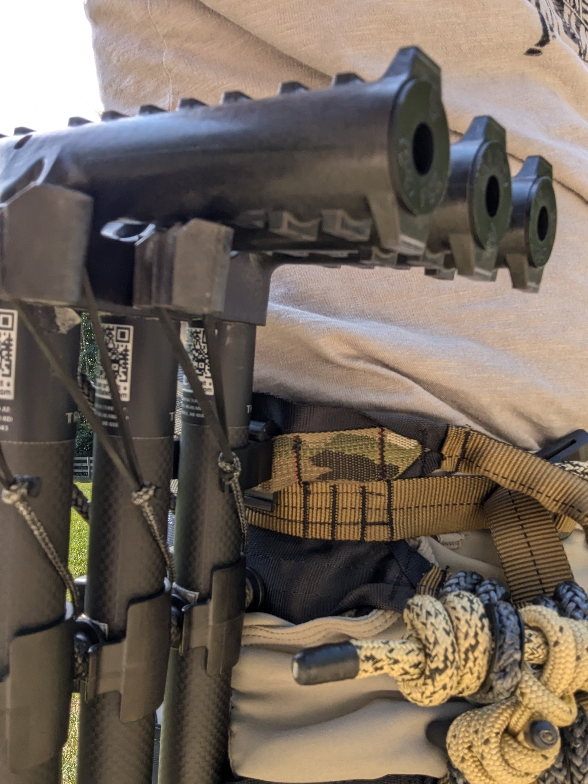TreeStyx climbing stick caddy. The bracket stays on the stick and the back clip easily lifts on/off a molle loop or a 1" belt for when climbing. The caddy is capable of holding 1, 2, or 3 sticks at once! Two pieces held together with a stainless steel screw. Stick(s) and saddle not included.
