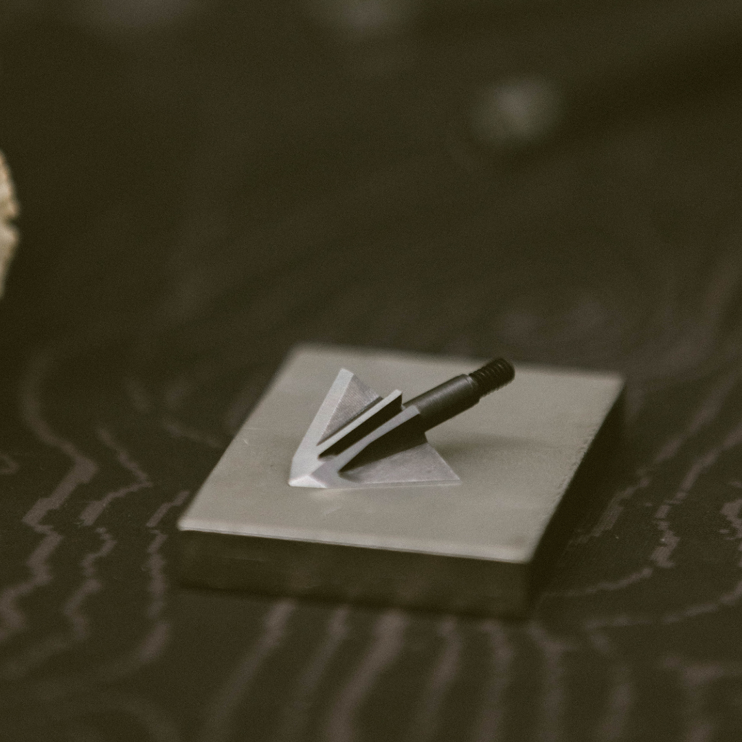 The smoothly integrated ferrule forms a wedge from tip to tail, designed to hold the wound channel open allowing the arrow shaft to pass through without interference. The sharp Tanto tip cuts on contact, time-tested for penetrating meat and bone. Directly following the tip is a massive asymmetric blade section that uniquely combines the bone splitting action of a single bevel broadhead with the inherent toughness of a double bevel broadhead. After the bone begins to split, the mechanical advantage of the wedge-shaped ferrule acting in concert with rotation of the true single bevel blades cause devastating fracturing of the bone. The sharp single bevel blades then slice through arteries and organs like a fine razor, causing massive bleeding and deep penetration.